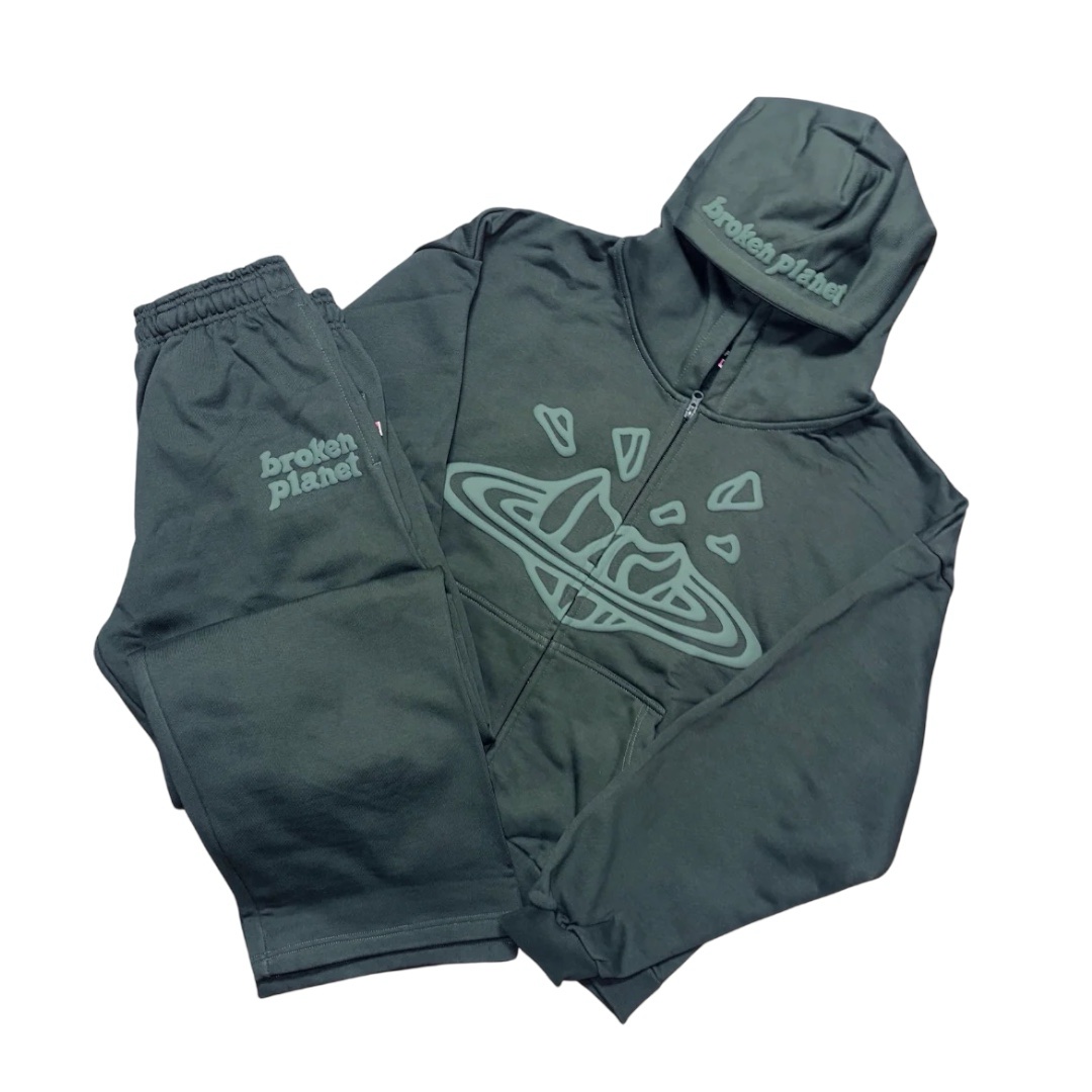 Emerald green Broken Planet zip-up hoodie tracksuit with bold planet-style detailing and a heavyweight, oversized streetwear fit made for everyday wear.