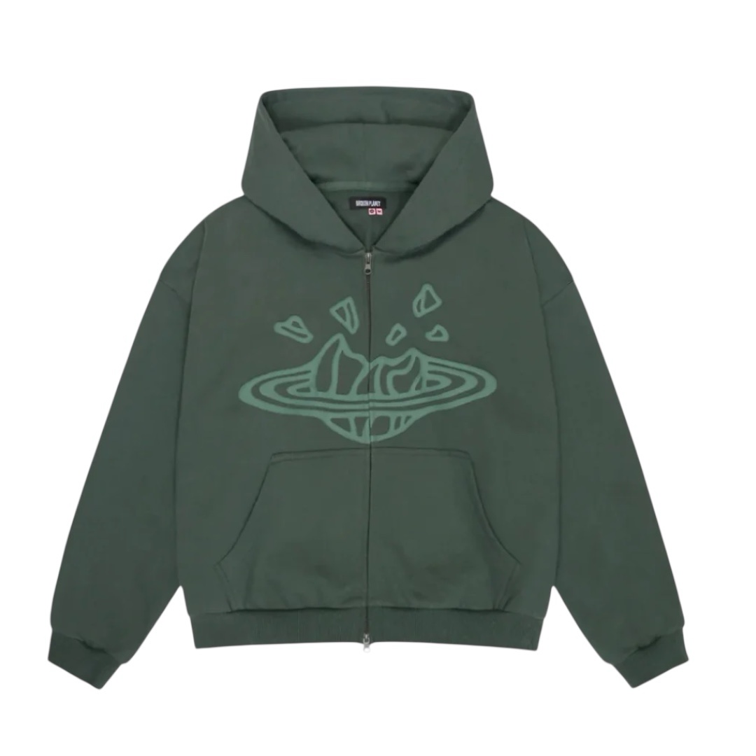 • Emerald green zip-up hoodie with Broken Planet graphics on the front and back