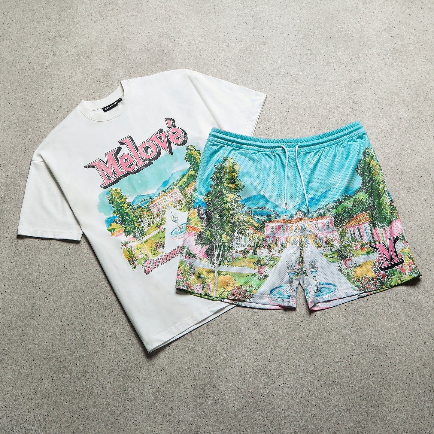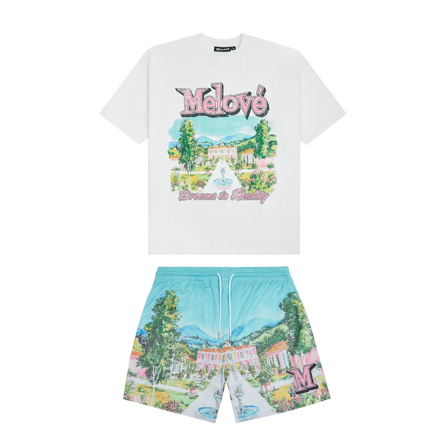 • Dreams To Reality luxury mansion print across the shorts