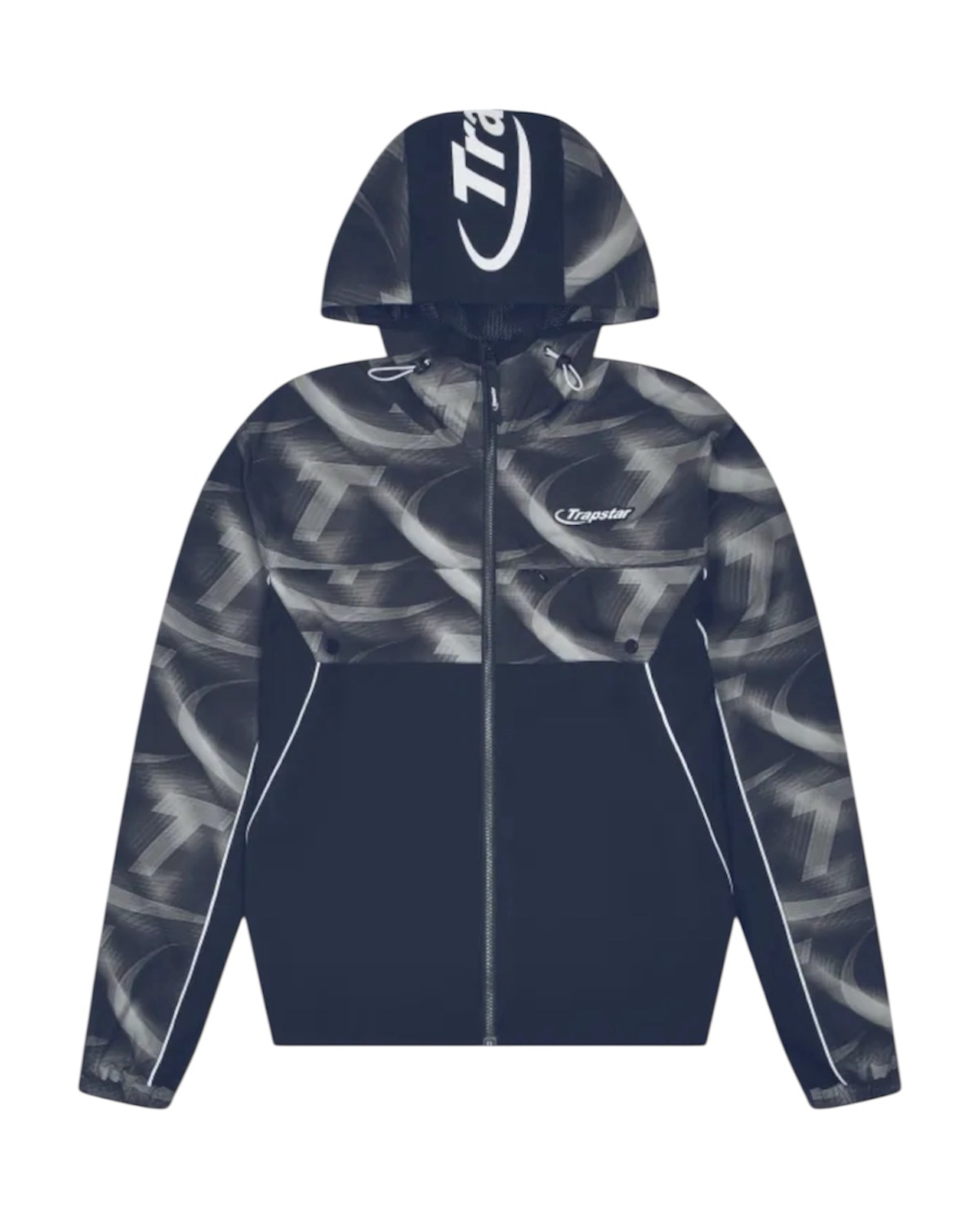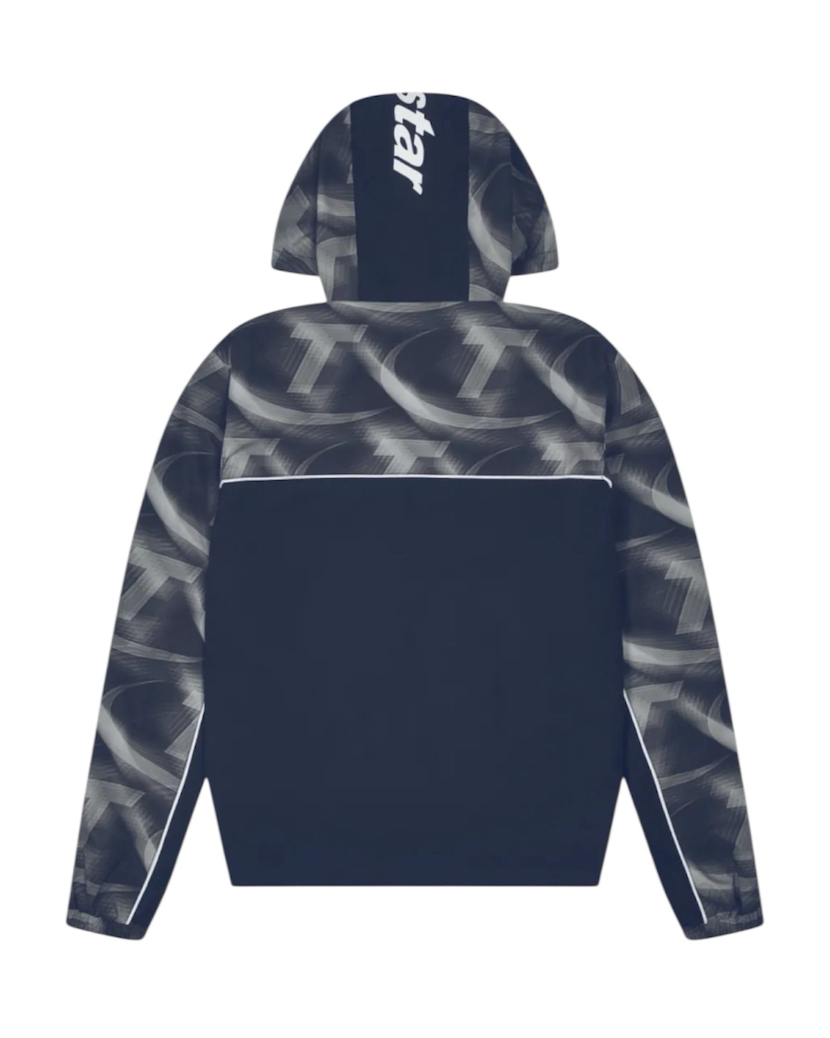 Navy Trapstar Hyperdrive print windbreaker with bold graphic detailing and a lightweight streetwear feel, built for layering with a relaxed, easy fit.